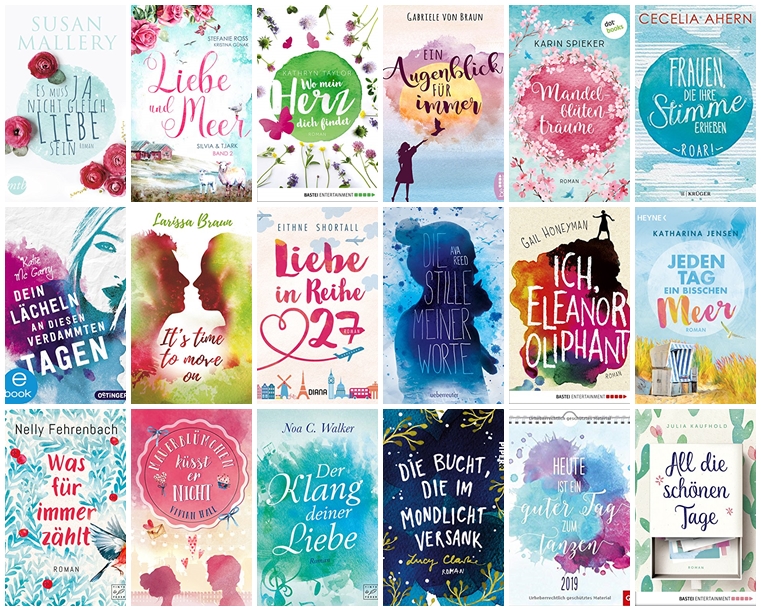 Der verträumte Look macht sich sehr gut auf Liebesgeschichten in jedem Genre. 2018 haben viele Cover ihre Aquarelltexturen im Hintergrund getragen, gepaart mit Illustrationen, ausgeschnittenen Fotomotiven oder Silhouetten.